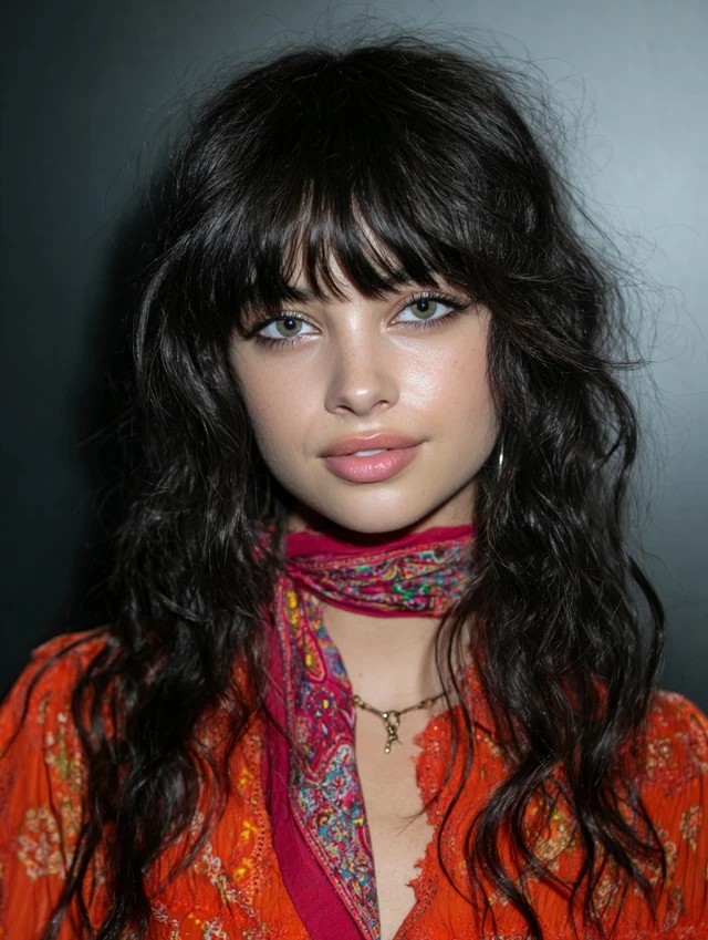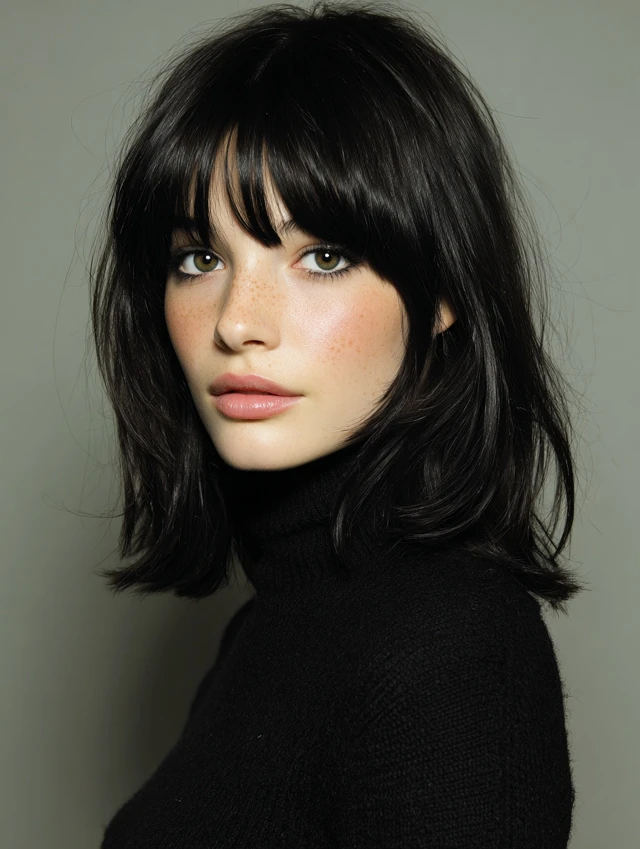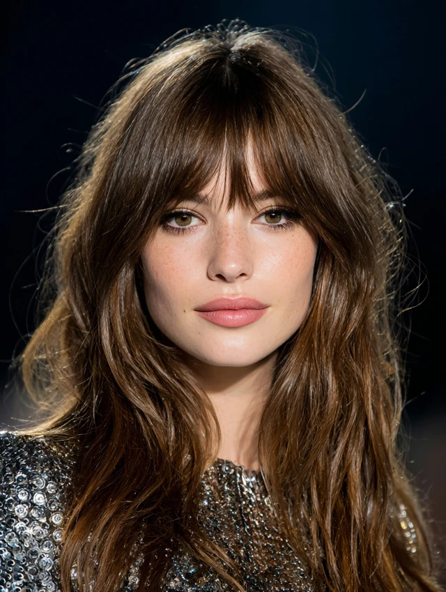 Wispy fringe highlights the eyes and cheekbones.