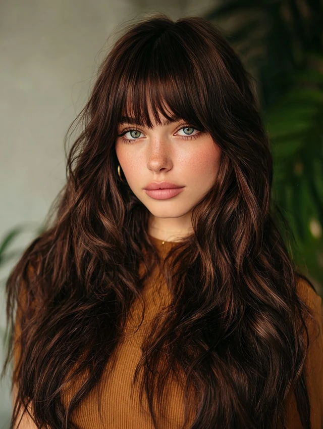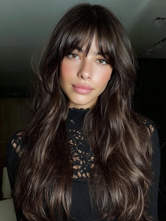Wispy fringe adds a youthful, trendy twist to flowing long locks.
