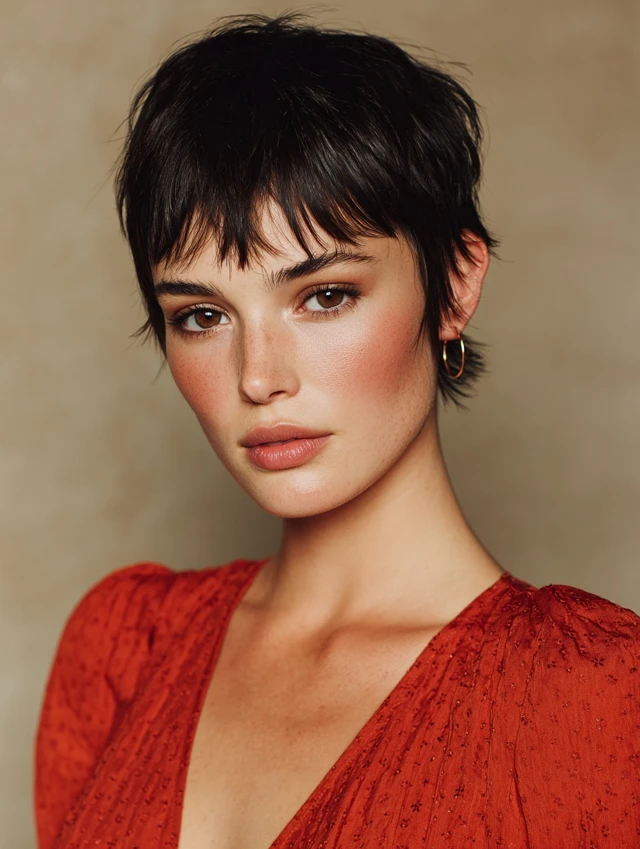 Short, soft bangs create a playful, fresh look.