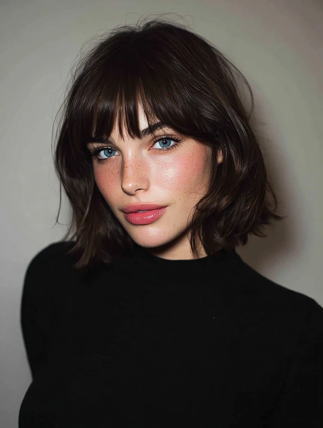 Short, soft bangs complement a sleek bob for a polished yet playful look.