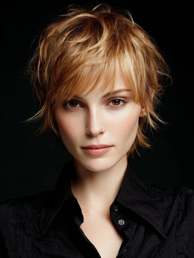 Balanced short-back pixie with longer front layers creates a versatile, chic look.
