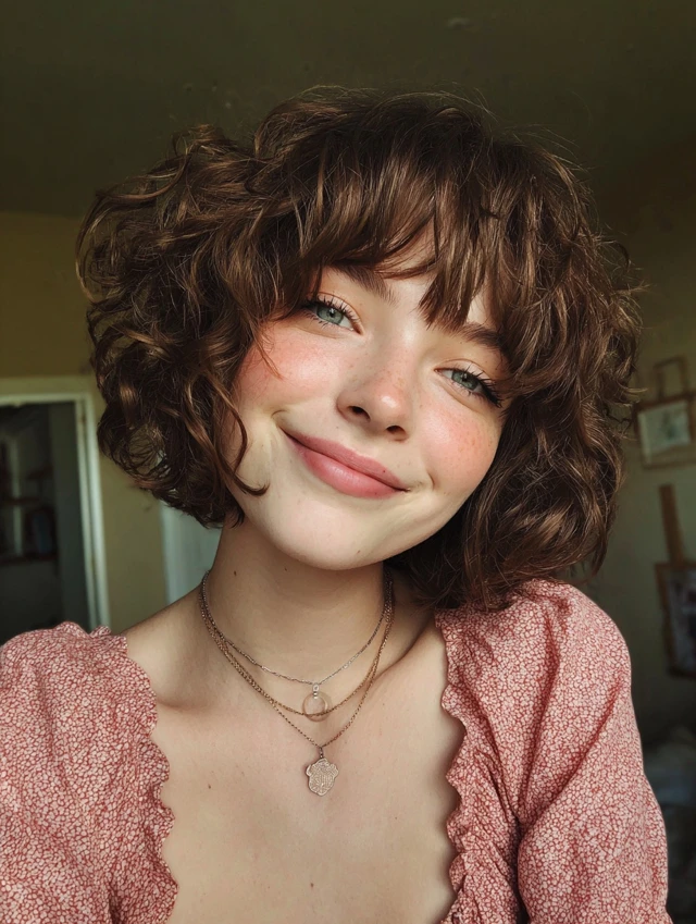 Why It Works: Embraces natural texture beautifully—voluminous curls with layered bangs frame the face softly.