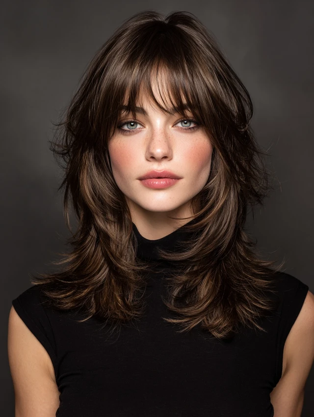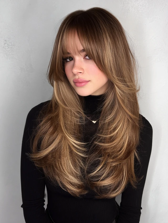 If you want a hairstyle that is stylish, easy to maintain, and frames your face beautifully, feathered layers with bangs are a perfect choice.