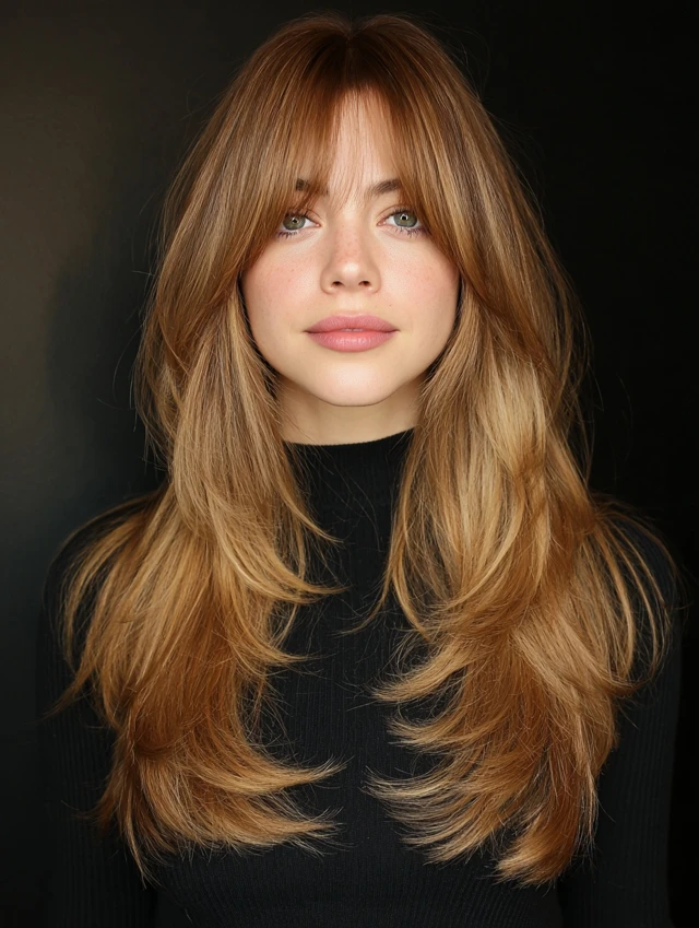 Keeps length while adding soft, flowing layers and face-framing curtain bangs.