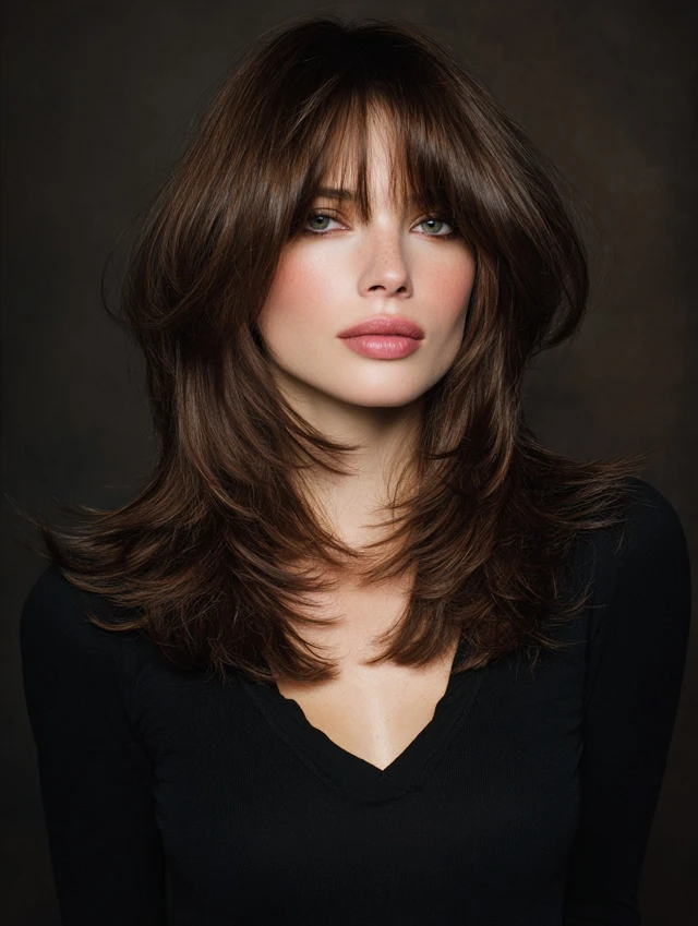 1. Classic Shoulder-Length Feathered Layers with Bangs