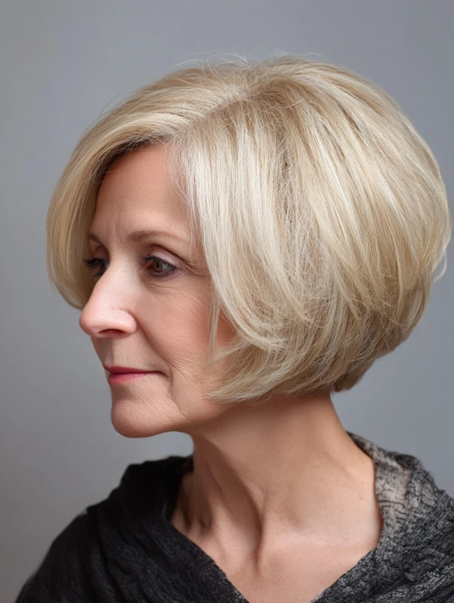 A graduated bob — shorter at the back and gradually longer toward the chin — is engineered for volume. The stacked layers at the back create a rounded shape that lifts fine hair naturally.
