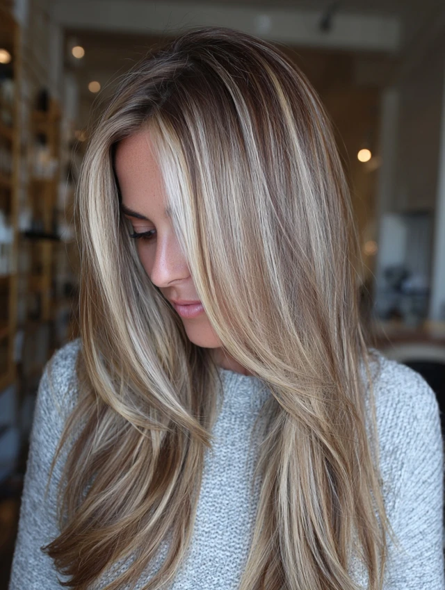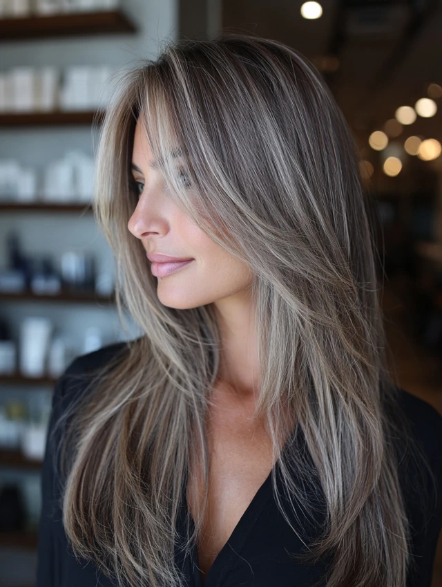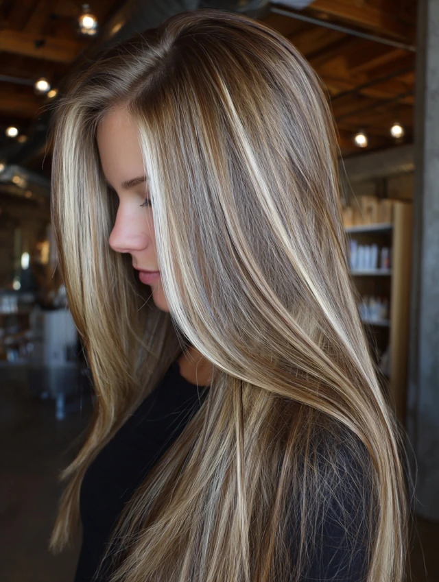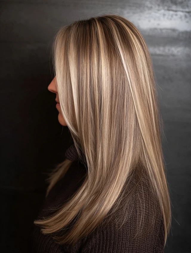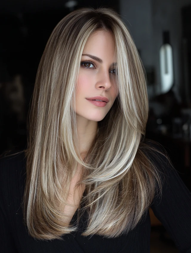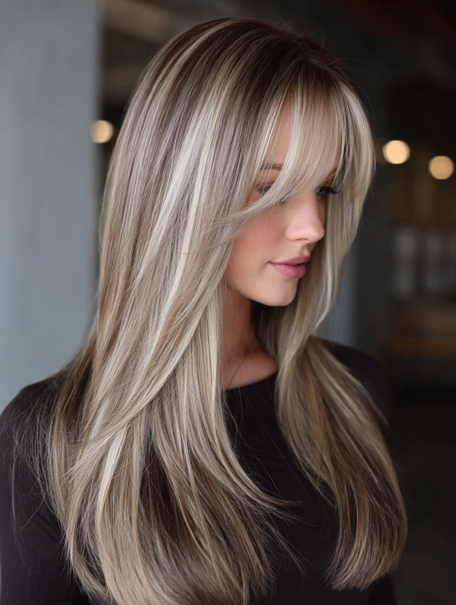 Ash blonde highlights give a cool, modern contrast that looks very defined on straight hair.