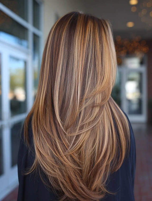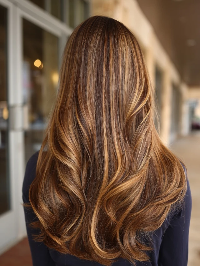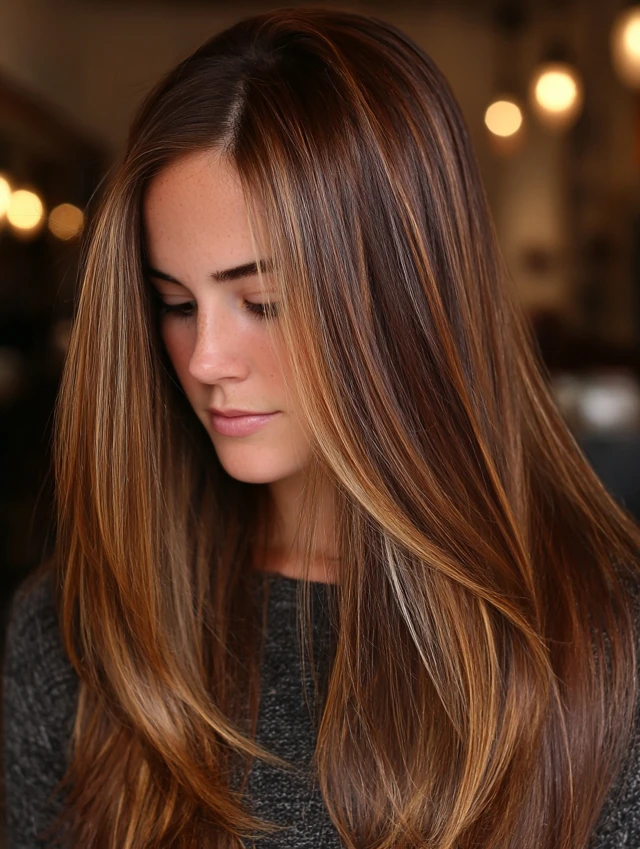 Honey highlights add golden warmth that enhances shine on straight strands.