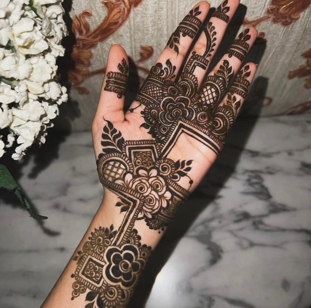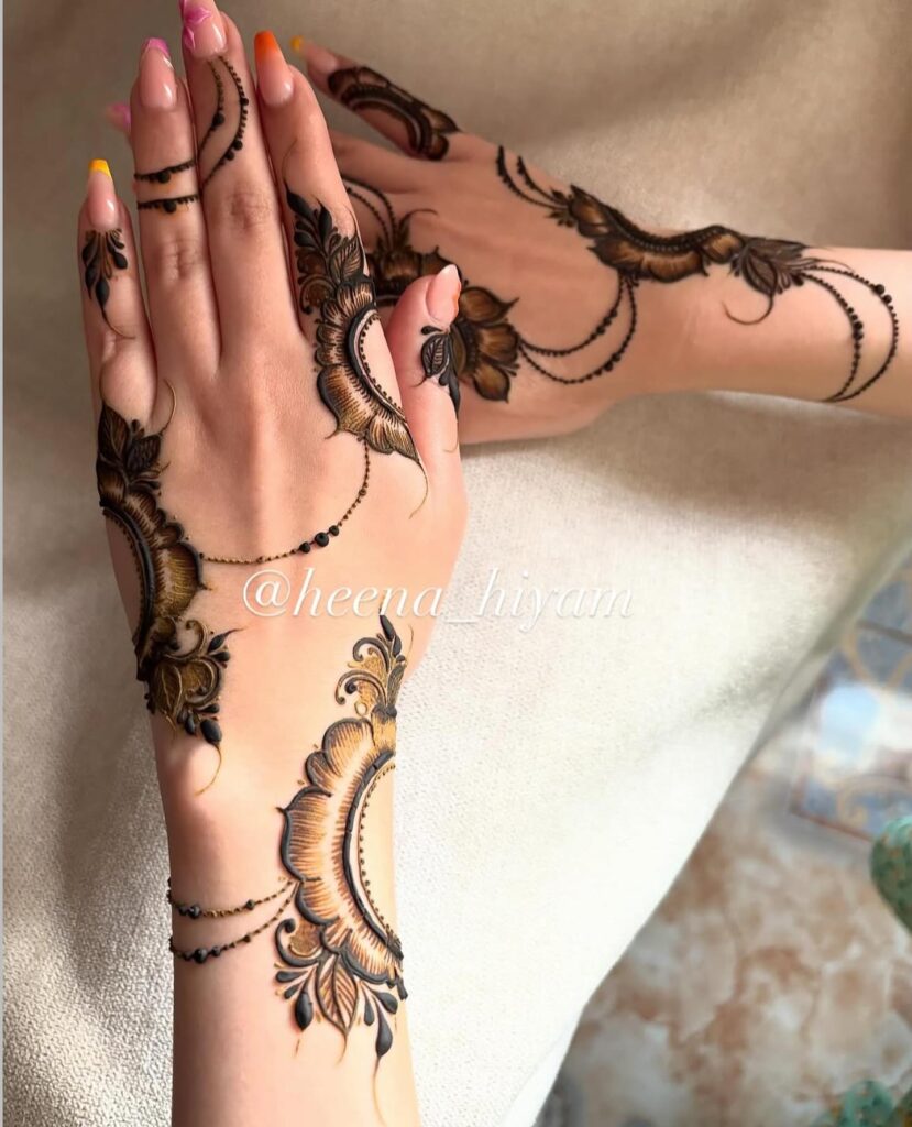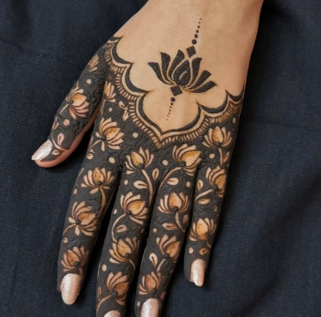 The second design combines bold floral motifs with lace-like swirls across the palm and back of the hand. The circular flowers and curved patterns create a layered, ornamental effect that feels rich and festive. Each detail contributes to a look of luxury and artistry.