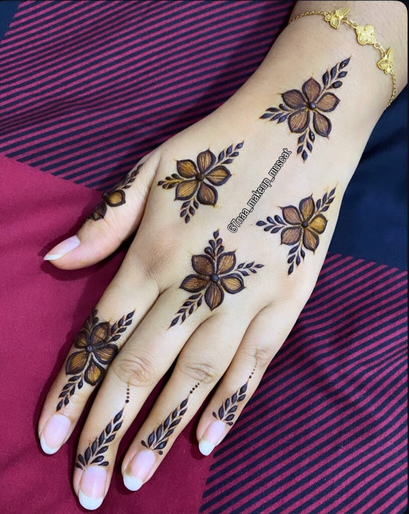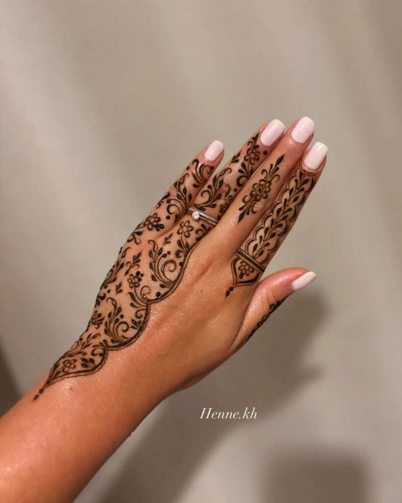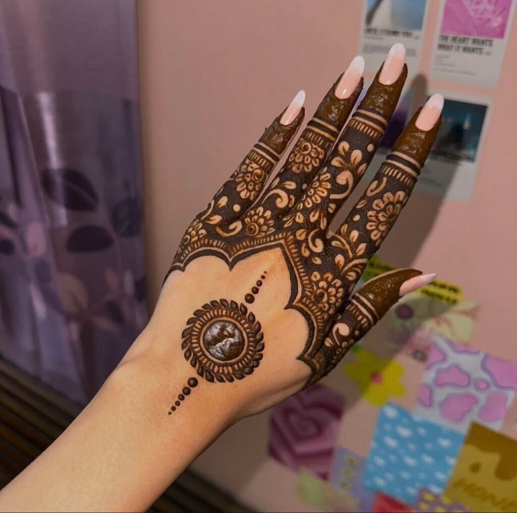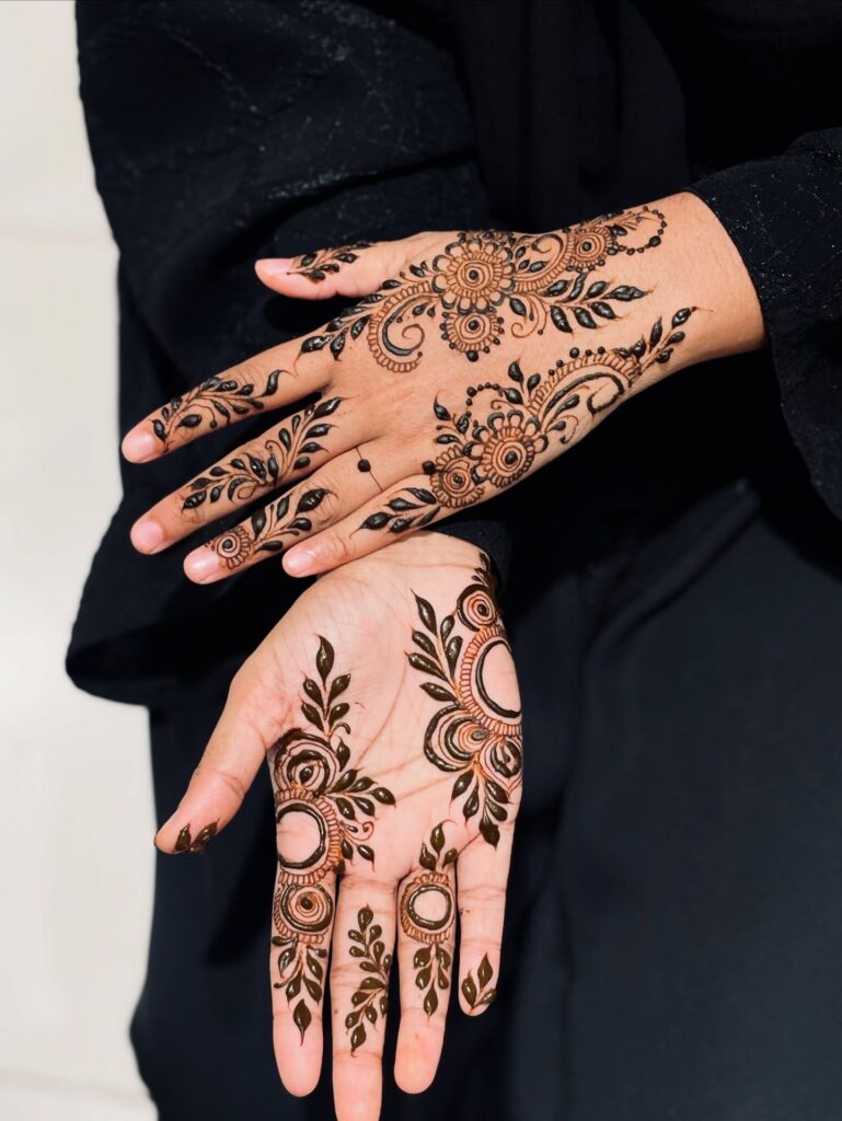 The second design combines bold floral motifs with lace-like swirls across the palm and back of the hand. The circular flowers and curved patterns create a layered, ornamental effect that feels rich and festive. Each detail contributes to a look of luxury and artistry.