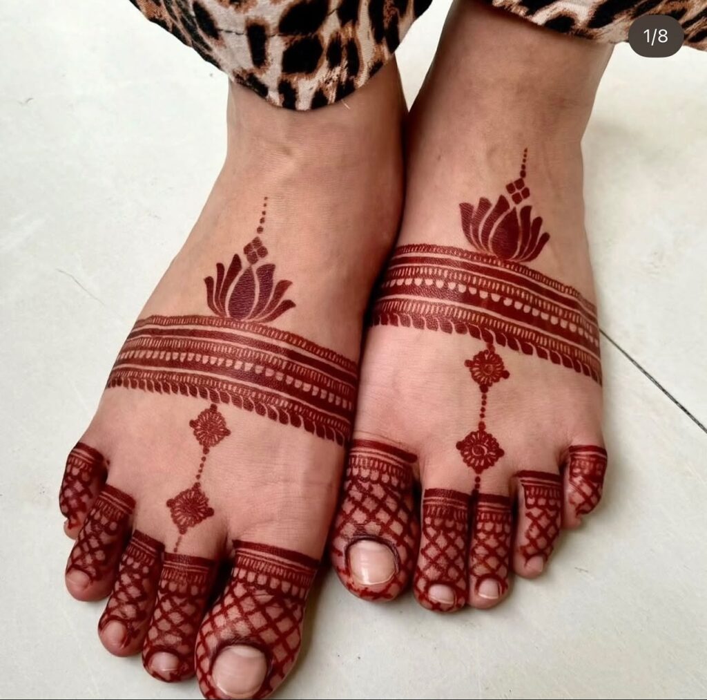 This design features a lotus motif at the top of each foot, extended by lace-like borders and clean geometric lines across the toes. Its symmetry adds balance, while the negative space keeps the design minimal and neat.