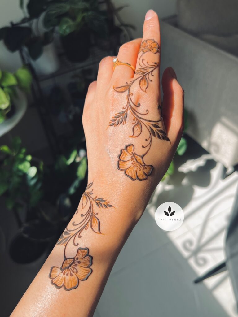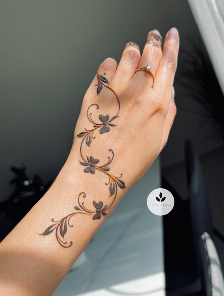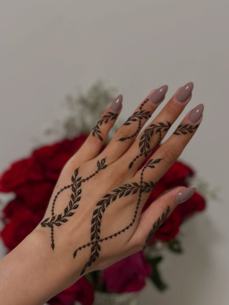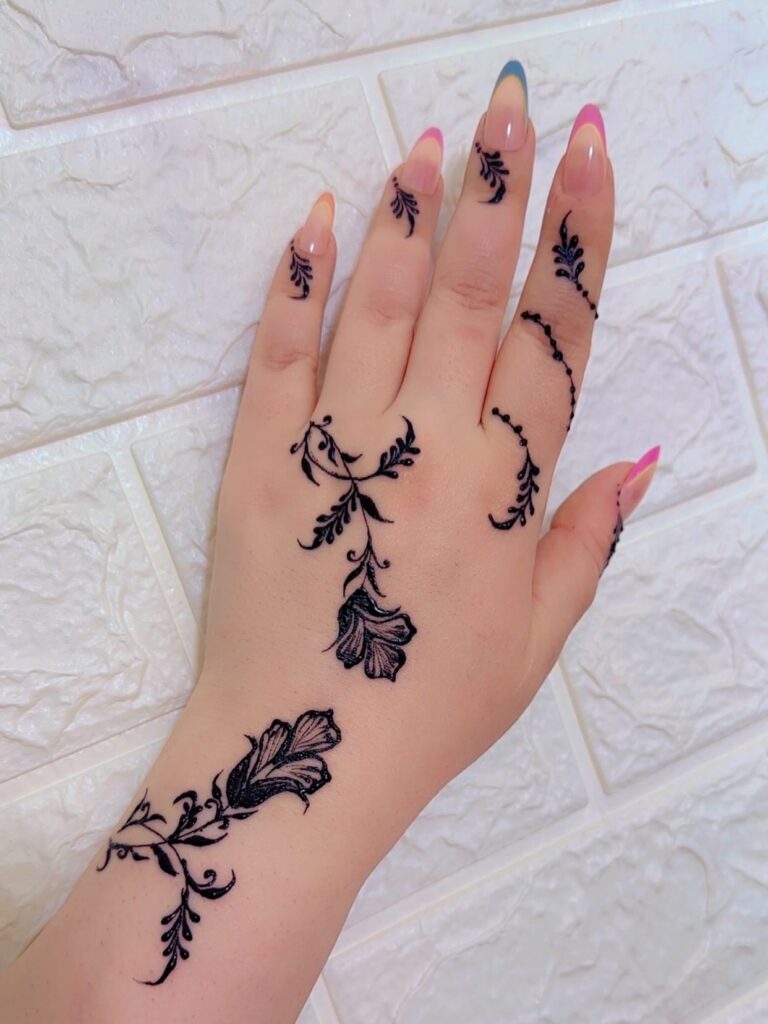 The thirteenth design focuses on flowing vines and floral lace patterns, running from the wrist up to the finger. The fine swirls and leaves give it a natural, airy look, making it an understated yet graceful piece.