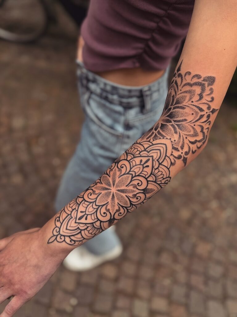 This lace tattoo extends across the forearm with a mandala-inspired style. Bold outlines and dotwork shading create depth, while floral lace patterns radiate outward in balanced symmetry. It feels both ornamental and meditative in its complexity.