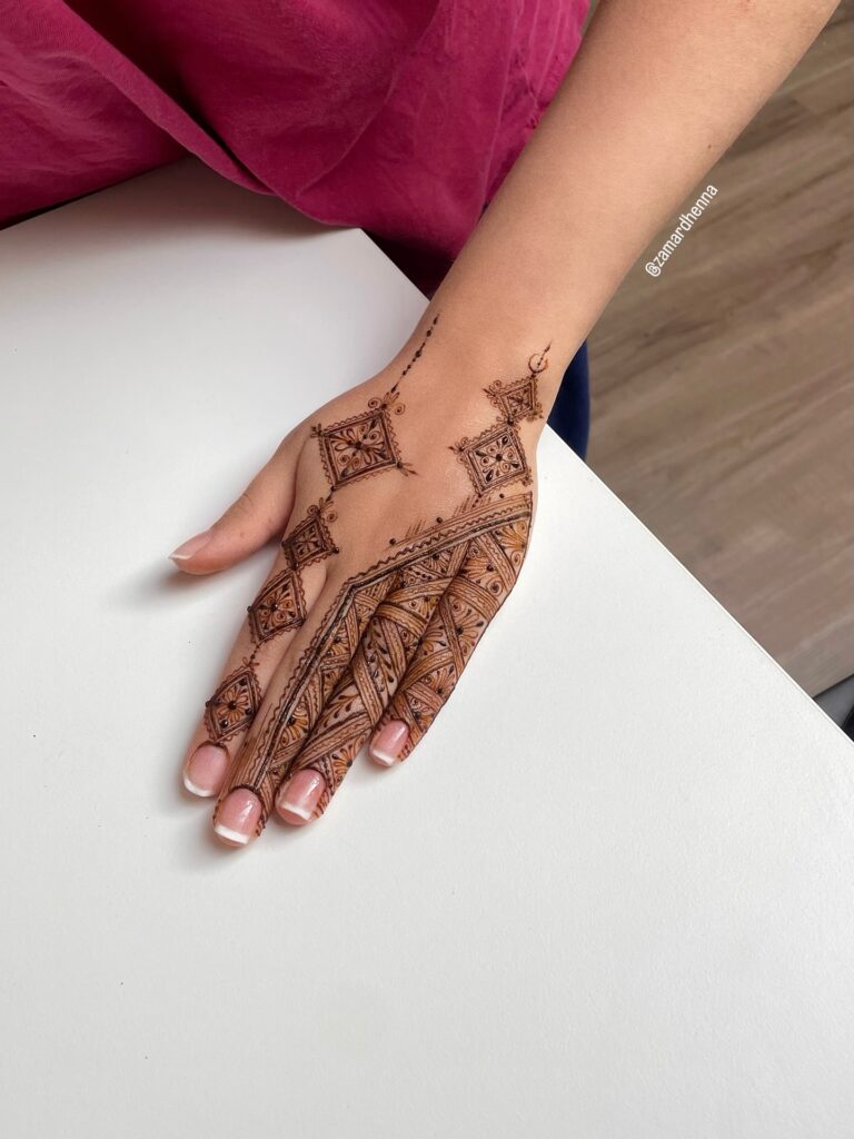 Unlike floral-based lace tattoos, this design showcases bold geometric shapes and detailed diamond motifs. The angular patterns cover the hand with precision, creating a look that is both traditional and structured, echoing cultural textile inspirations.