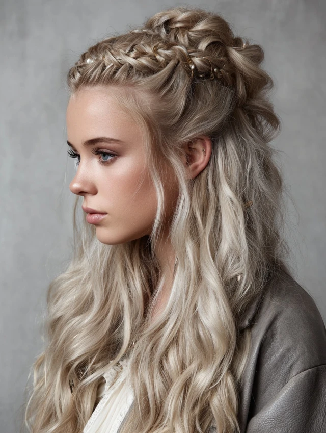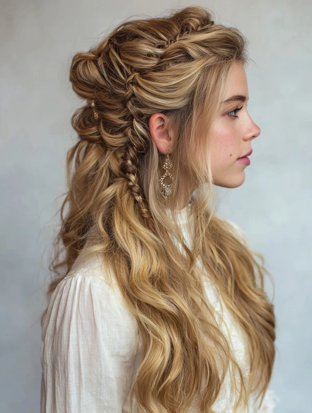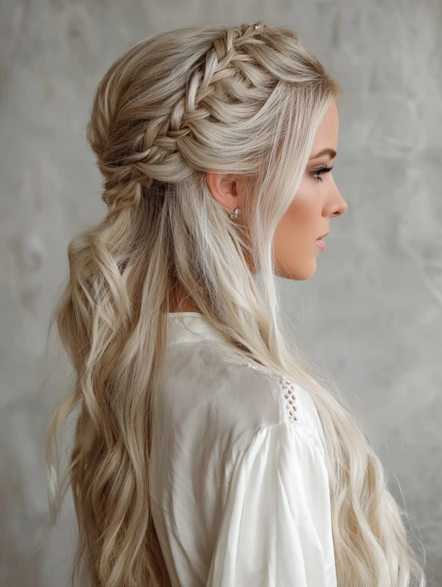 Laced strands on top while leaving the rest flowing creates a soft, bohemian vibe.