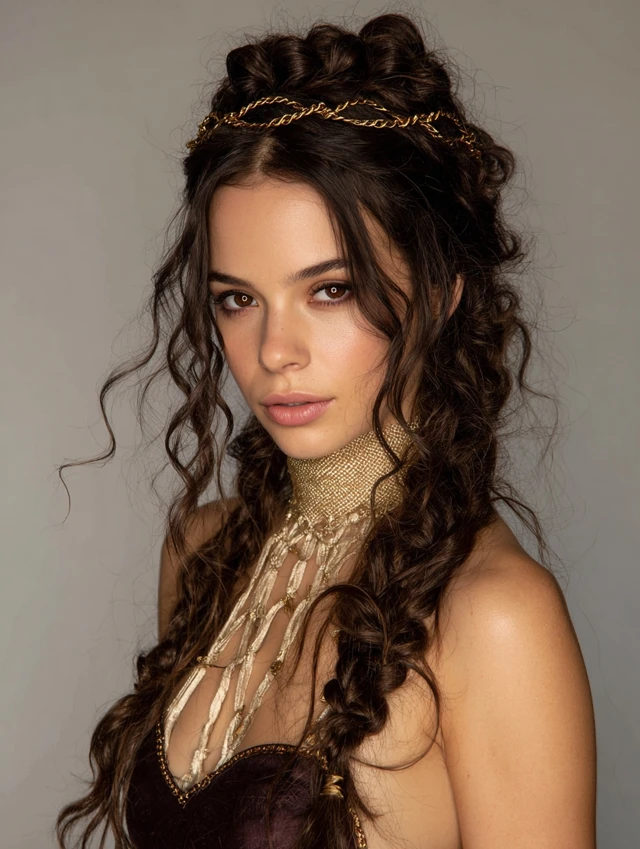 Strands laced around the head create a regal, boho-inspired effect.