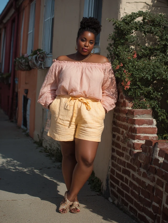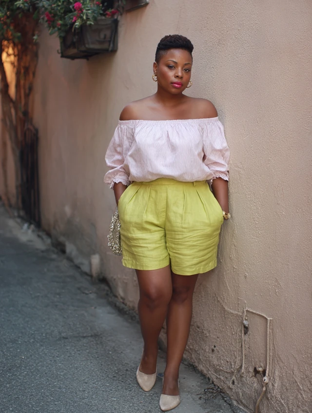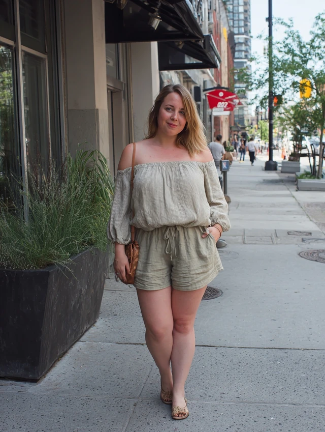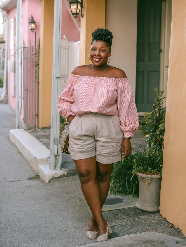 3. Linen Shorts + Off-Shoulder Blouse + Flats