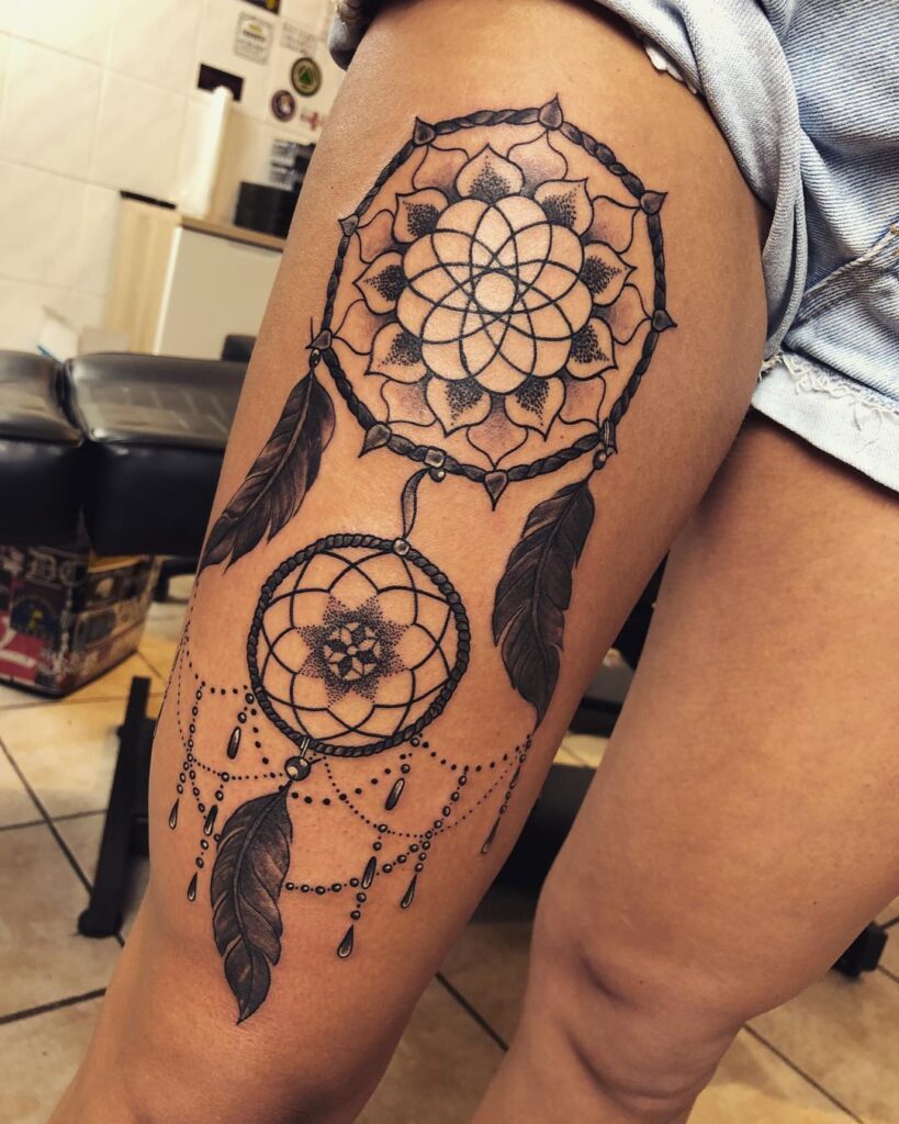 This thigh tattoo features two dreamcatcher mandalas stacked vertically, connected with bead chains and detailed feathers. The larger design at the top radiates geometric petals, while the smaller one beneath mirrors its symmetry. Droplet-like elements add elegance, while dark shading enhances depth.