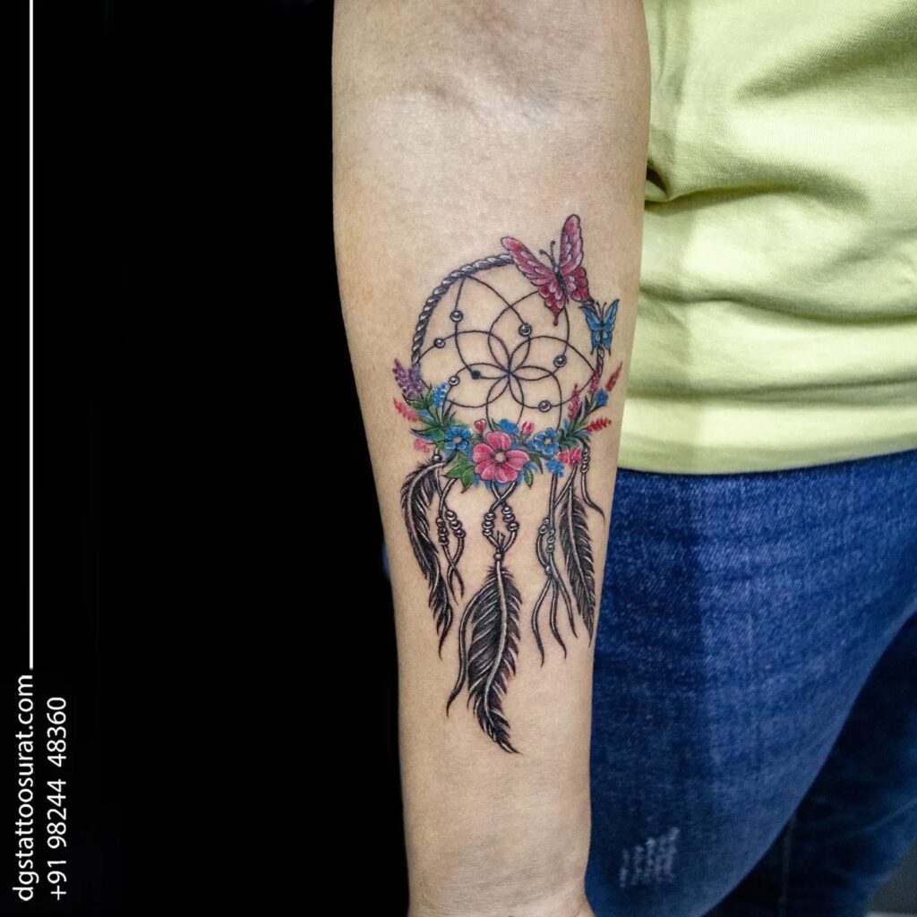 This forearm tattoo combines the structure of a dreamcatcher with vibrant details like pink blossoms, green leaves, and butterflies perched on its frame. The feathers flow elegantly, shaded in dark tones for contrast against the colorful florals.