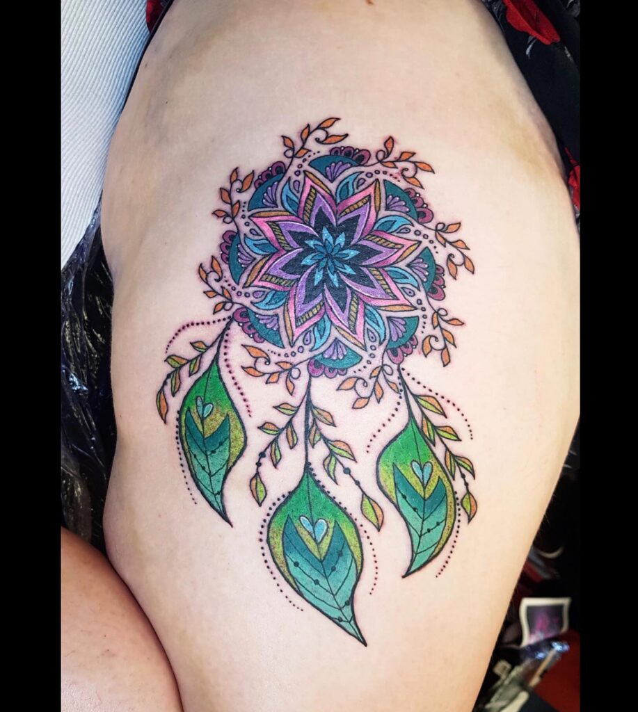 Vibrant Mandala Dreamcatcher Tattoo with Leaves