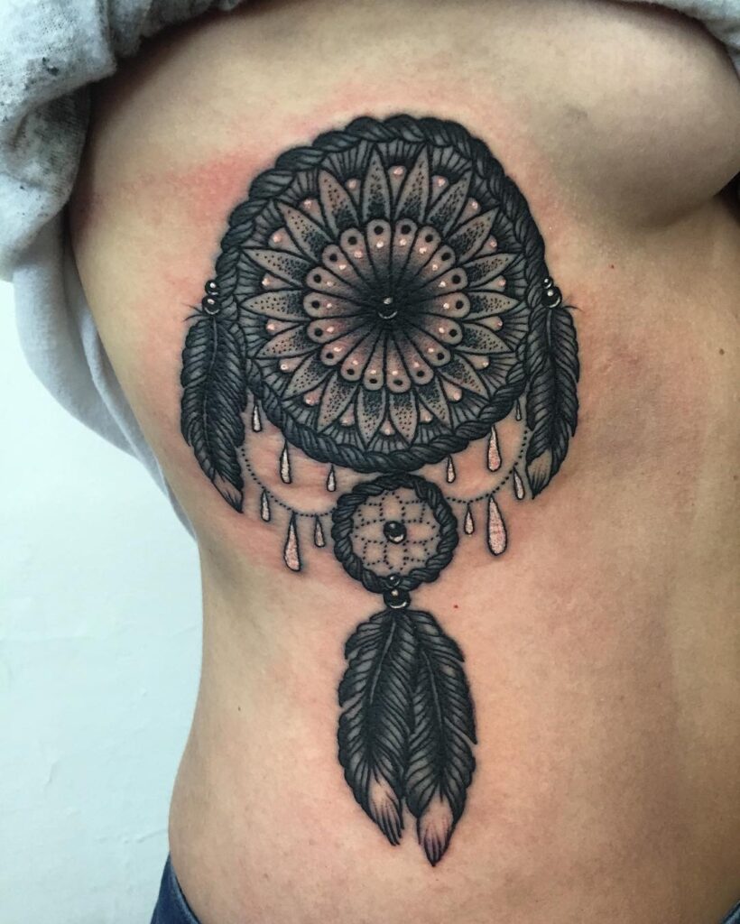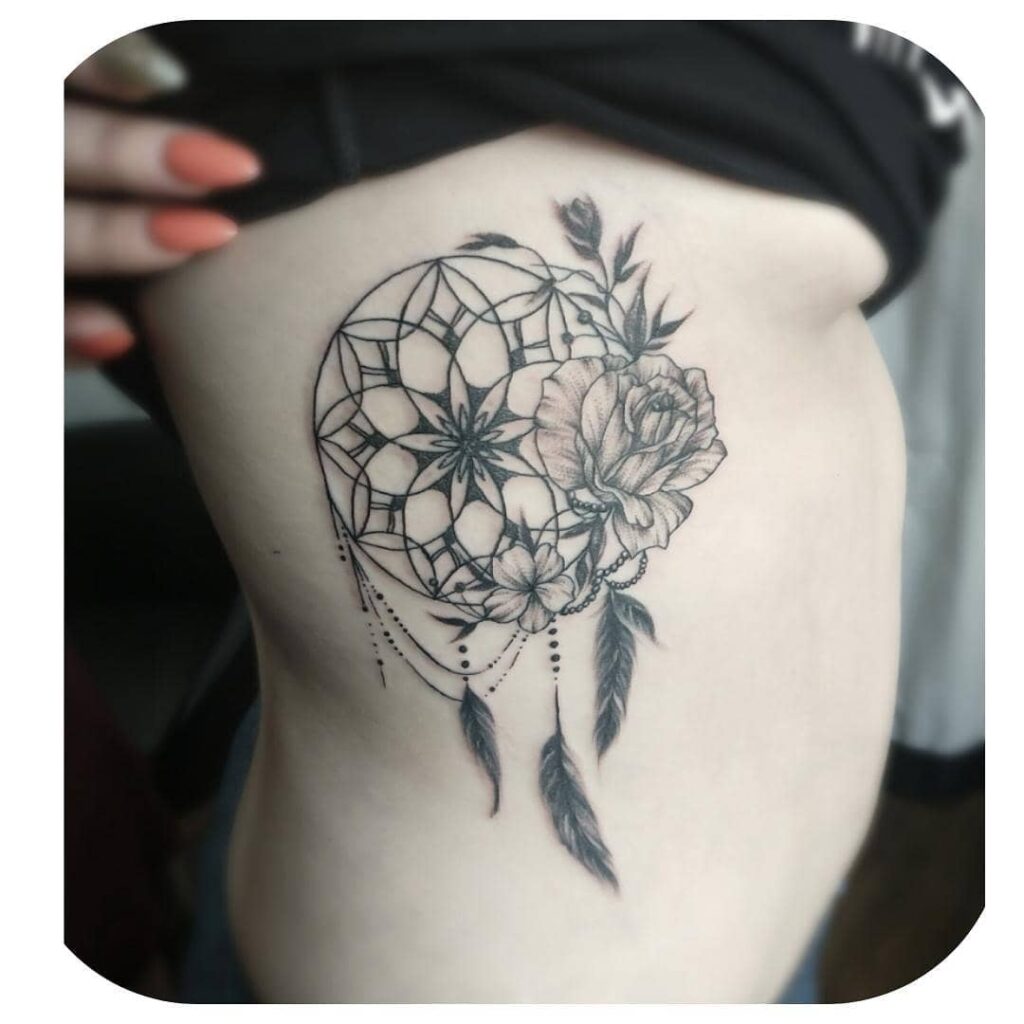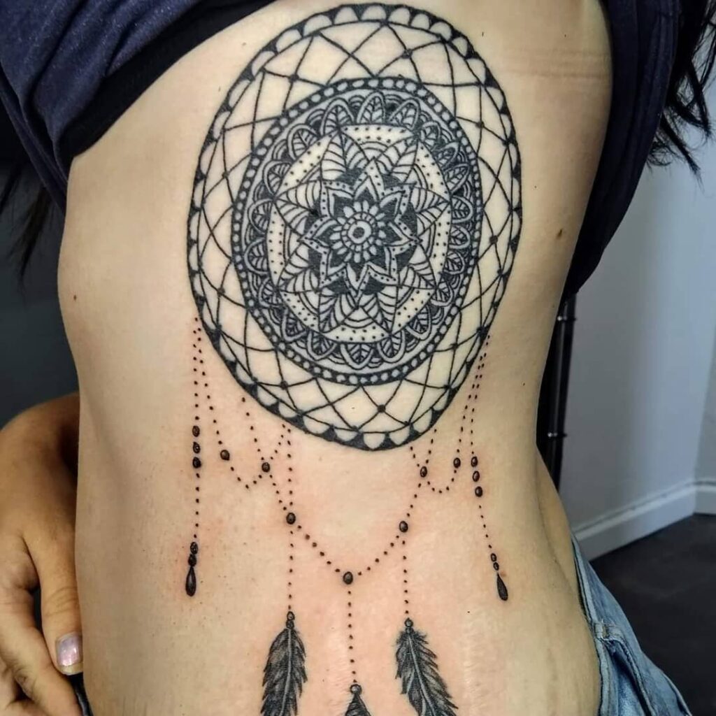 This tattoo stretches beautifully across the ribcage, featuring a large mandala enclosed within a woven dreamcatcher frame. Its sharp symmetry radiates outward, while delicate dotted chains descend, carrying feathers that flow naturally. The design uses bold black ink with fine dotwork shading to highlight every layer.