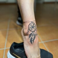 This tattoo features a timeless design, with a bold mandala framed by a braided circle that mimics a dreamcatcher. Dangling chains and multiple feathers flow gracefully below, shaded with intricate linework to give a realistic effect. The use of dotwork shading enhances the mandala’s depth, creating a mesmerizing centerpiece.