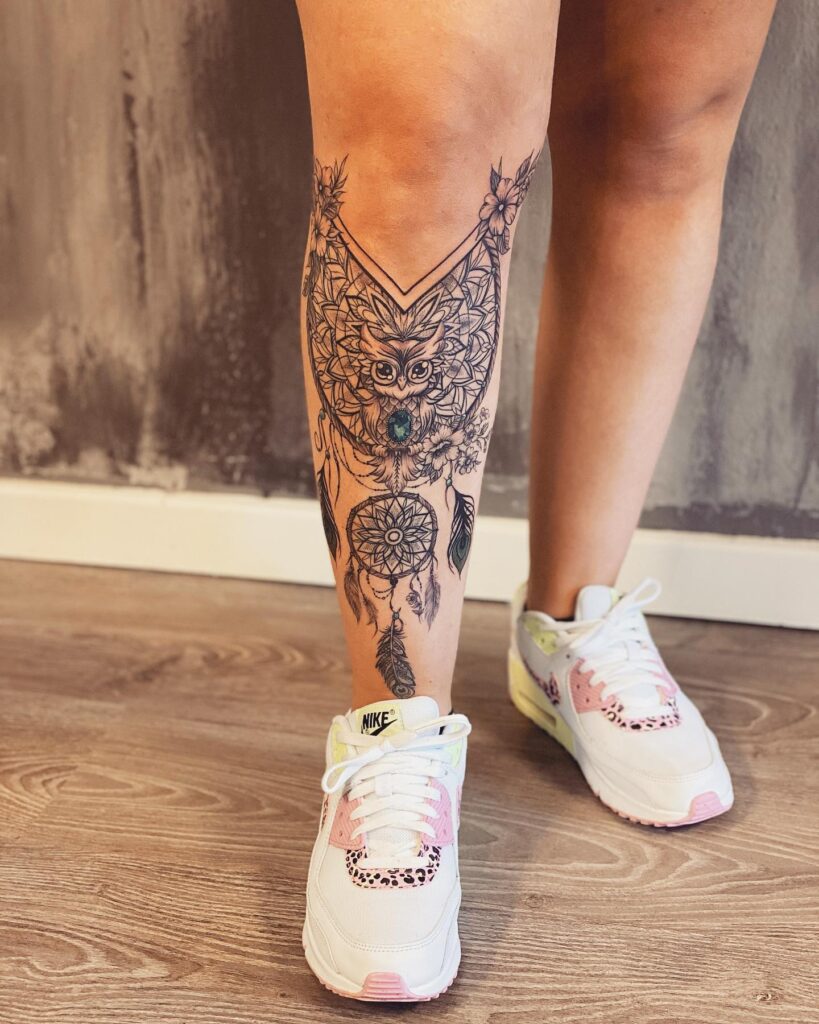 This tattoo is a masterpiece, combining an owl with mandala dreamcatcher elements for a powerful design. The owl, placed at the knee with wide wings, is filled with geometric detailing, its eyes piercing and wise. Below, a dreamcatcher hangs, adorned with feathers and beads, completing the spiritual symbolism.