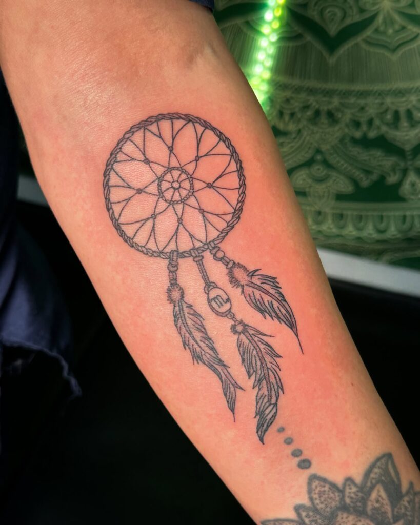 Placed on the forearm, this tattoo uses fine black lines to depict a simple dreamcatcher with three dangling feathers. The mandala pattern inside the circular frame is subtle, yet its clean symmetry speaks volumes.