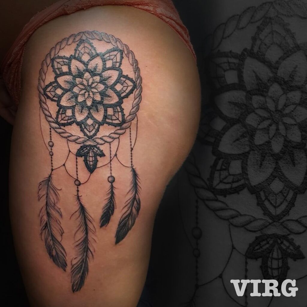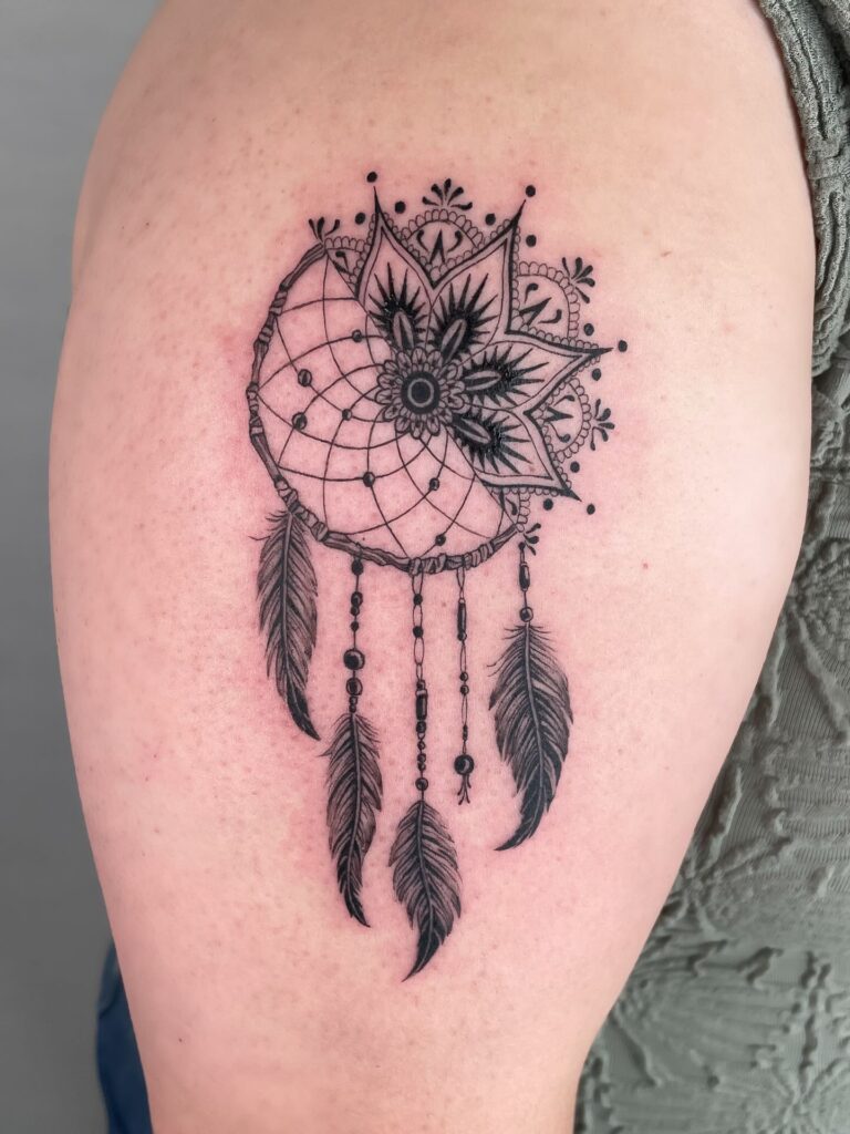 Placed on the thigh, this tattoo carries presence and symbolism, blending strength with softness. It reflects the idea of filtering dreams and channeling positive energy, making it a meaningful and protective choice for someone who wants a sacred and visually captivating design.