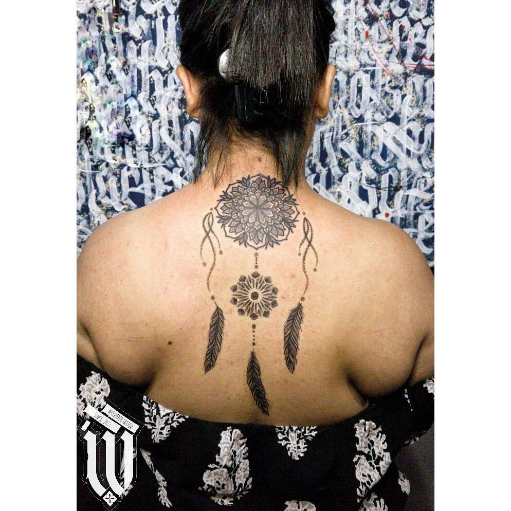 This back tattoo showcases a perfectly aligned double mandala design, connected with beads and feathers to mimic the elegance of a dreamcatcher. The top mandala rests between the shoulders, while the smaller one sits closer to the mid-back, creating balance and flow. Sharp black ink shading emphasizes the geometry, while the long feathers draw the eye downward.