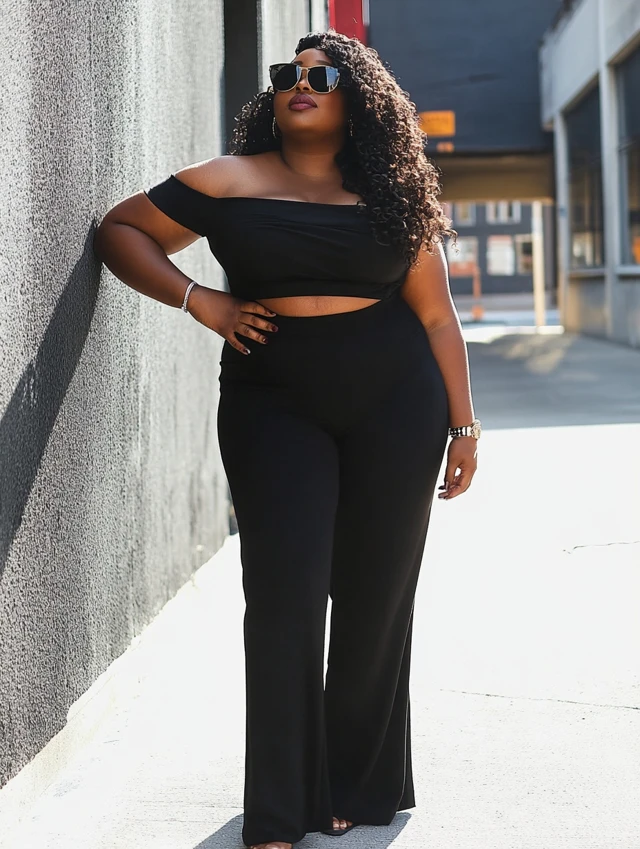 Why it works: Balances proportions by cinching at the waist and flowing at the leg. Crop top gives bold, unapologetic confidence.