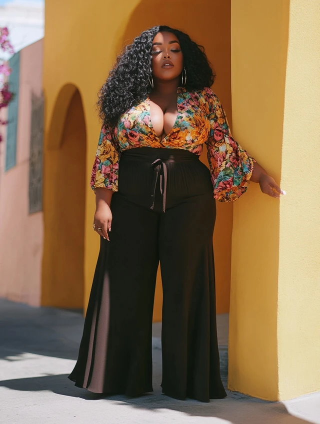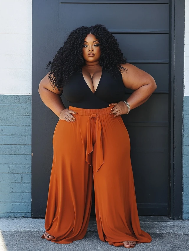 Why it works: Palazzo pants elongate the legs, while bodysuits smooth the silhouette.