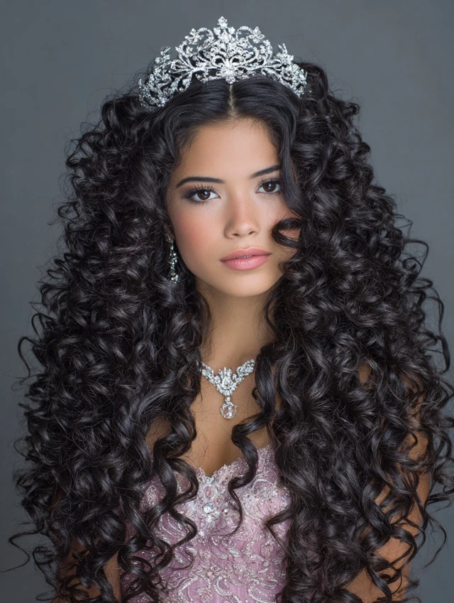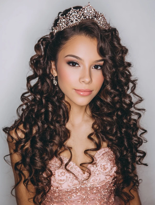 The classic Quinceañera look. Big, romantic curls create a princess vibe that frames the face beautifully while showcasing your crown.