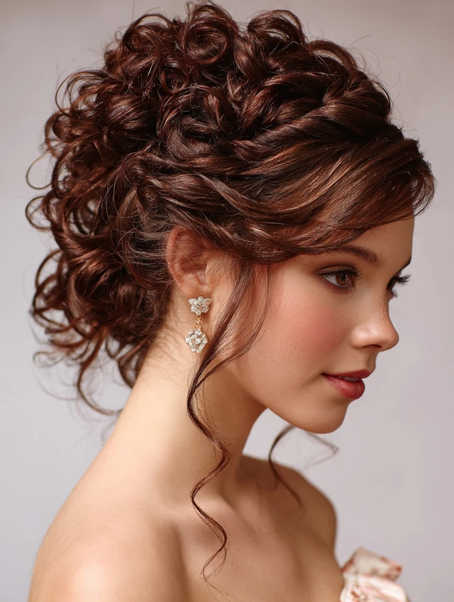 It’s soft, romantic, and perfect for showing off statement earrings or detailed dress necklines. The curls add balance and volume.