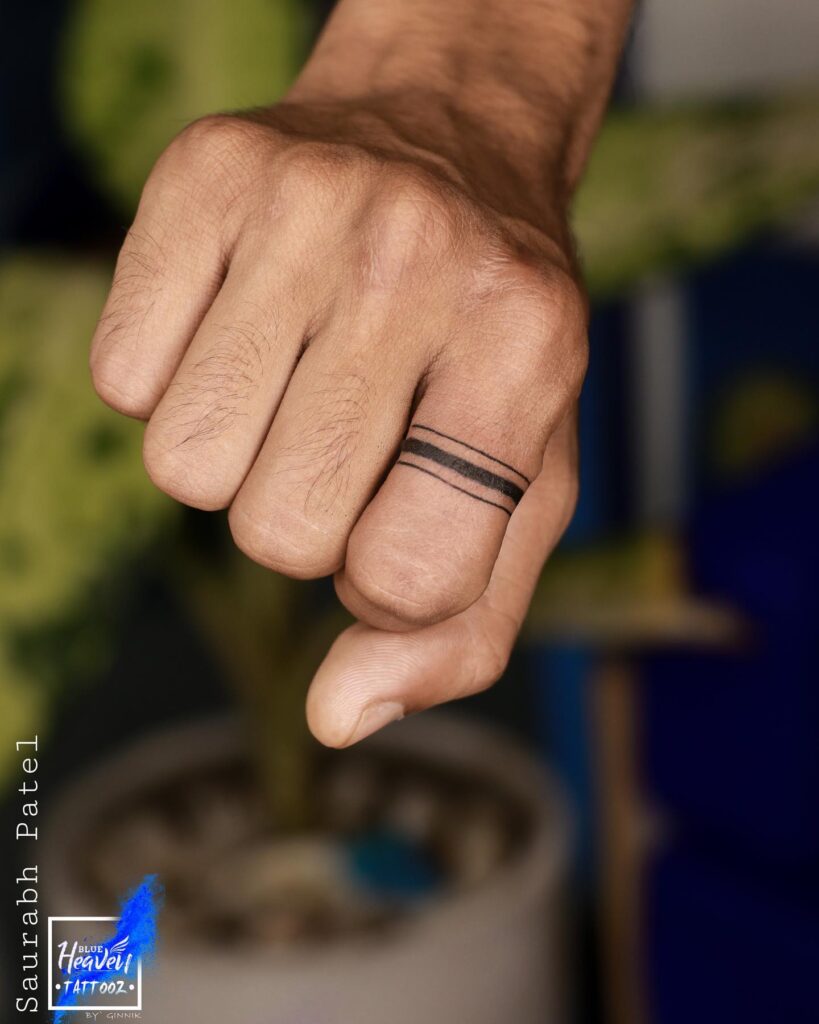 This tattoo features two simple, parallel lines circling the finger, creating the look of a minimalist yet bold ring. The clean spacing between the lines adds depth while maintaining simplicity.