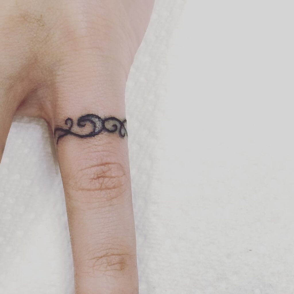 This tattoo wraps around the finger with flowing, wave-like tribal patterns that form a seamless and stylish band. The dark ink contrasts beautifully against the skin, giving it the look of a delicate yet powerful ring that carries both style and symbolism.