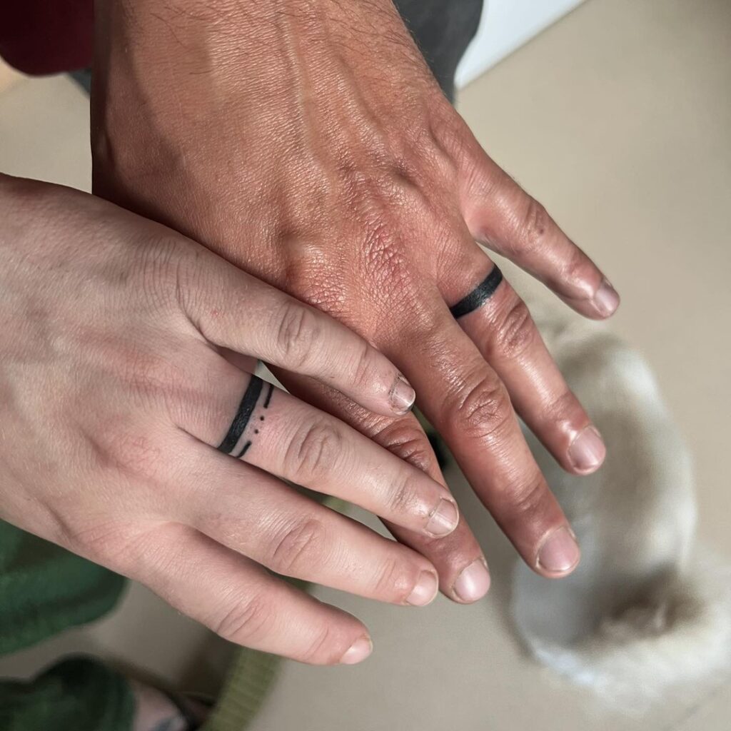 Couple ring tattoos like these highlight equality and mutual respect in a relationship. Their clean design makes them timeless and versatile, suitable for both men and women, and they act as permanent symbols of commitment that outlast traditional jewelry.
