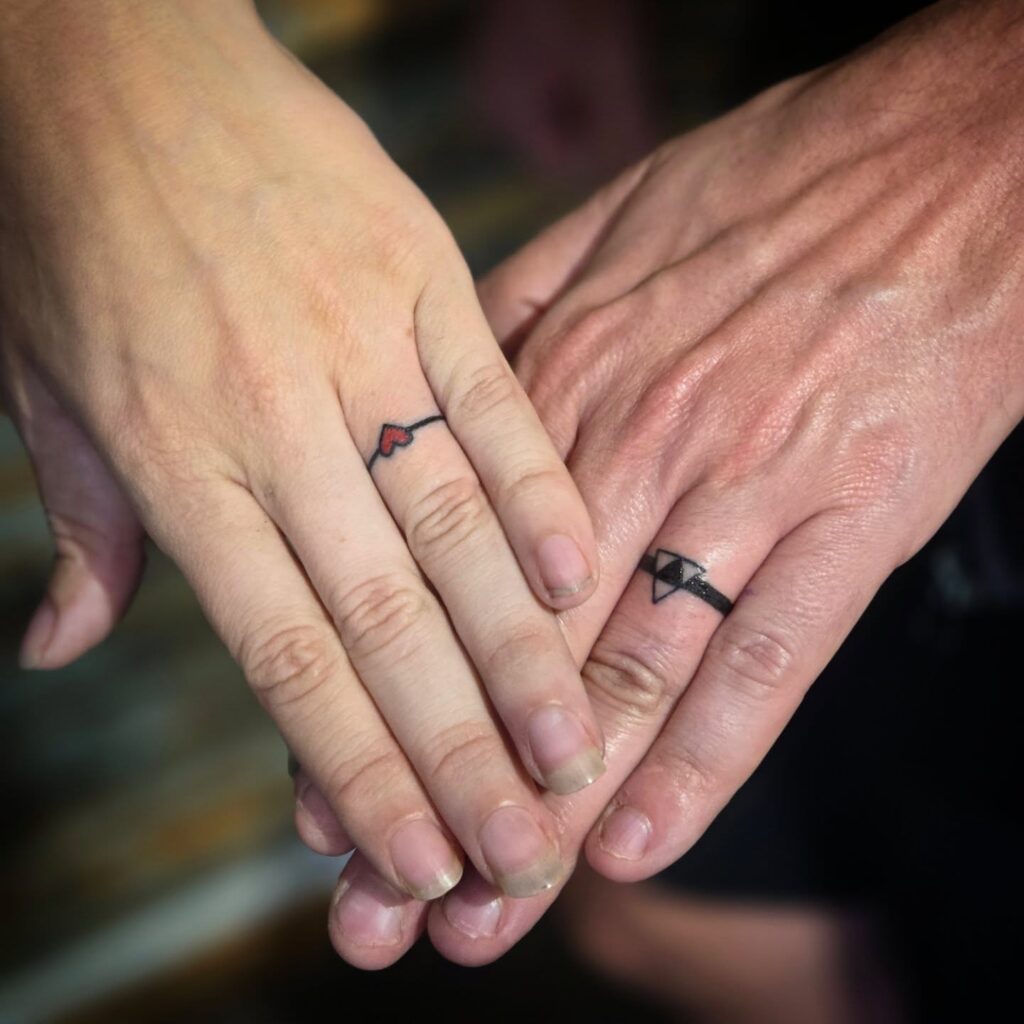7. Minimalist Couple Ring Tattoos with Heart and Geometric Design