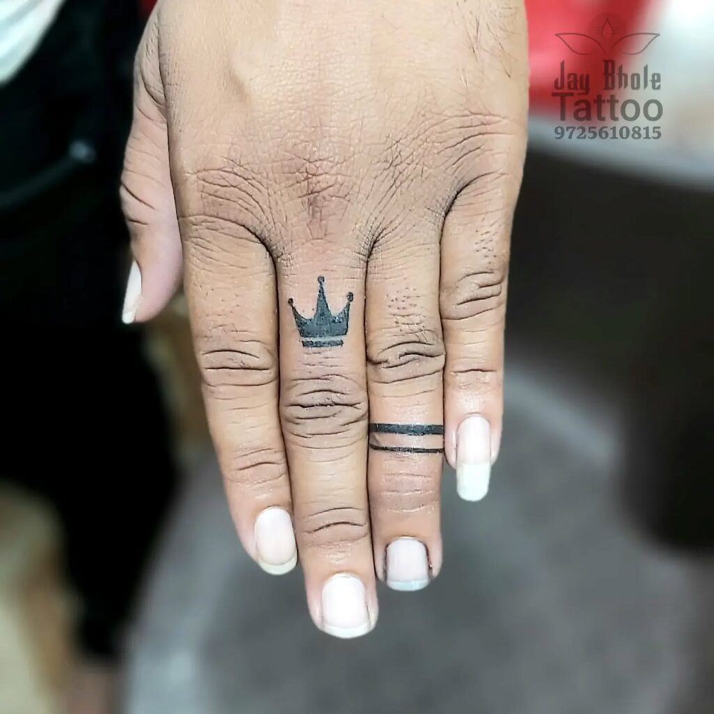 This striking finger tattoo features a regal crown on one finger and two bold parallel bands on the next. Together, the elements create a look that symbolizes authority, loyalty, and strength while maintaining minimalist charm.