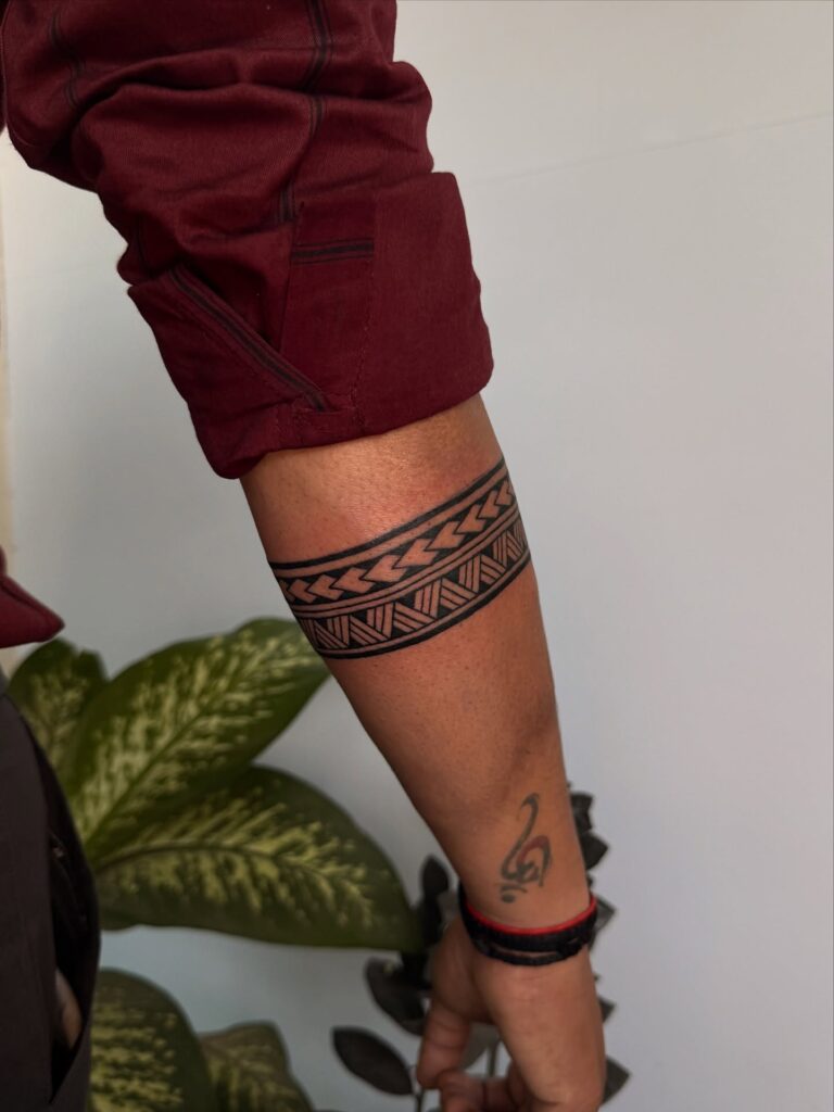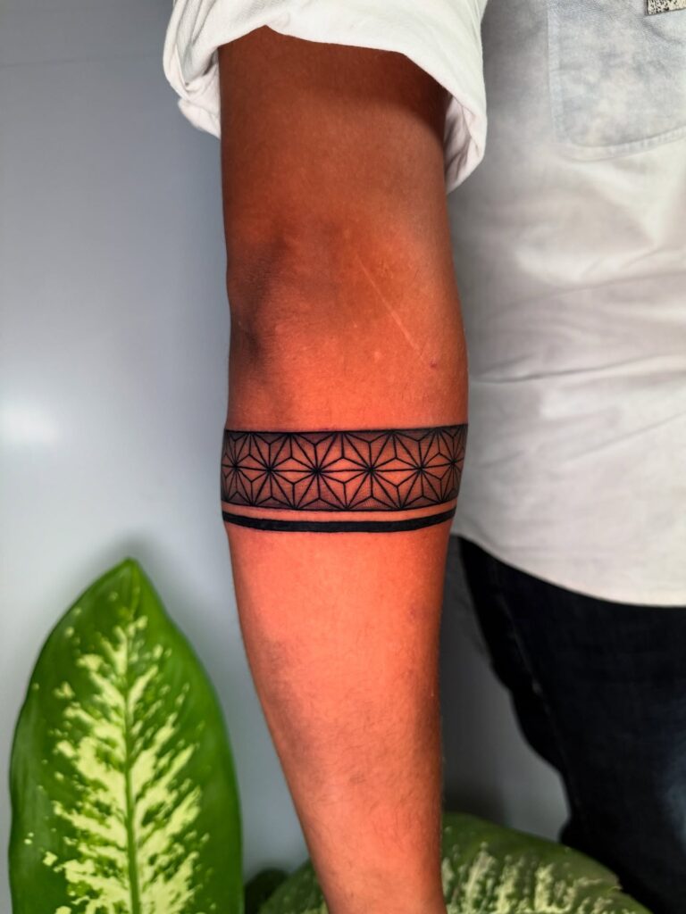 Though placed on the arm, this tattoo resembles a wide, intricate band that could inspire ring designs. The repeating floral geometric patterns form a seamless wrap that highlights precision and artistry.