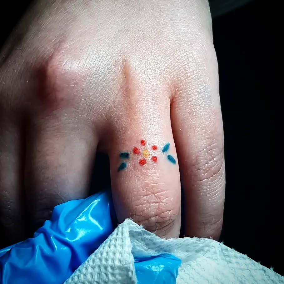 This delicate tattoo wraps around the finger with a series of colorful, tiny flowers. The petals are rendered in shades of red, orange, and green, giving the ring a soft and cheerful aesthetic.