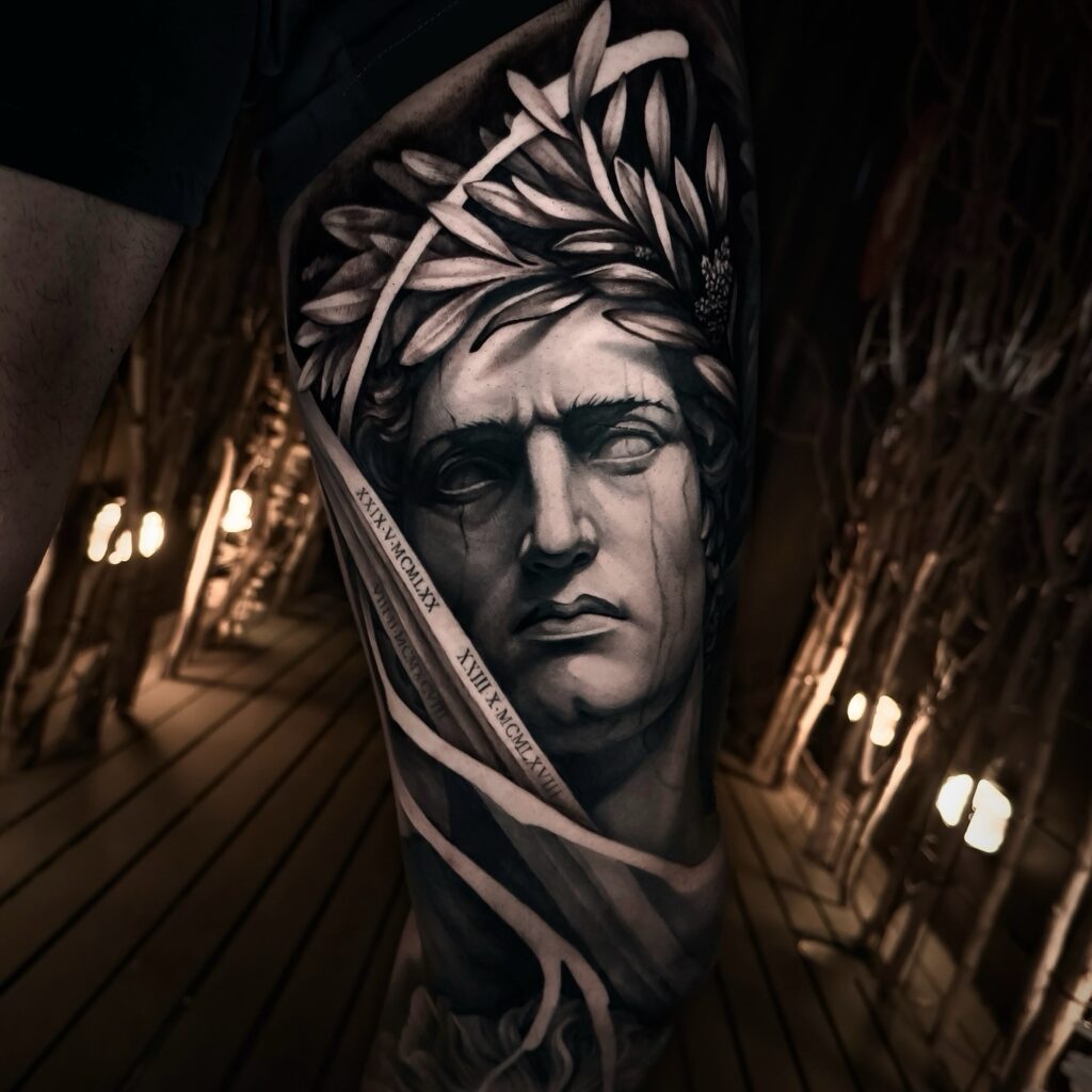 This tattoo shows a powerful Roman bust crowned with a laurel wreath, symbolizing triumph, authority, and divine favor. The shading highlights the intensity of the emperor’s gaze, while Roman numerals carved into draped cloth add an eternal quality. The design captures the grandeur of Roman leadership and its timeless sense of command.