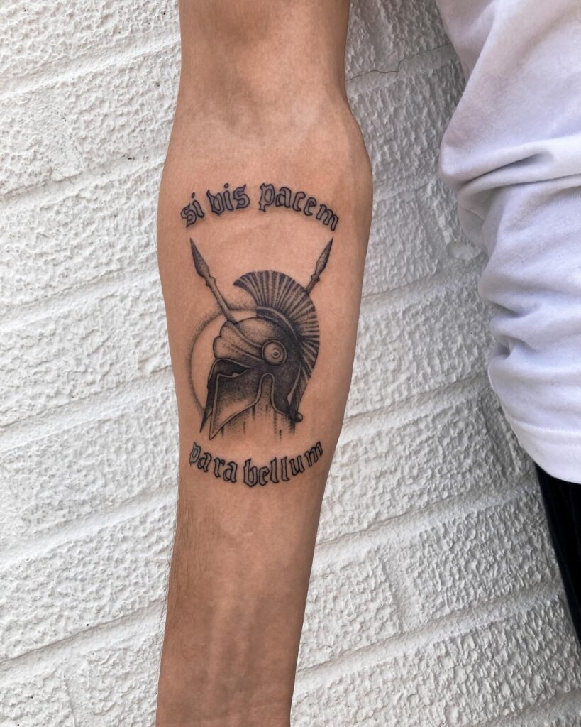 This tattoo features a Roman helmet paired with the Latin phrase “Si vis pacem, para bellum,” meaning “If you want peace, prepare for war.” The phrase captures the Roman belief that strength and readiness are essential to protect peace and stability.