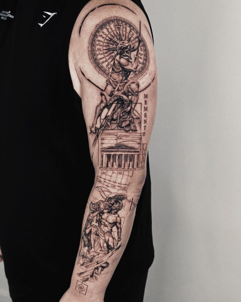 This elaborate sleeve combines Roman architectural elements, heroic figures, and the phrase “Memento,” meaning “remember.” A muscular warrior figure embodies strength and sacrifice, while the backdrop of Roman structures ties the tattoo to the grandeur of the empire.