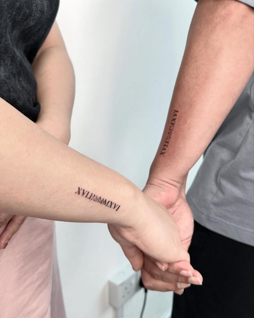This minimalist tattoo features Roman numerals inked on the arms of two people, symbolizing a significant date shared between them. The matching placement highlights connection, unity, and eternal remembrance of a special moment in time.