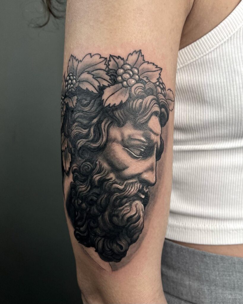 This tattoo depicts the Roman god Bacchus, the deity of wine, festivity, and ecstasy. His flowing curls and grapevine crown symbolize indulgence, vitality, and the celebration of life. The shading work enhances the regal yet contemplative look of the figure, making it a bold homage to Roman mythology.