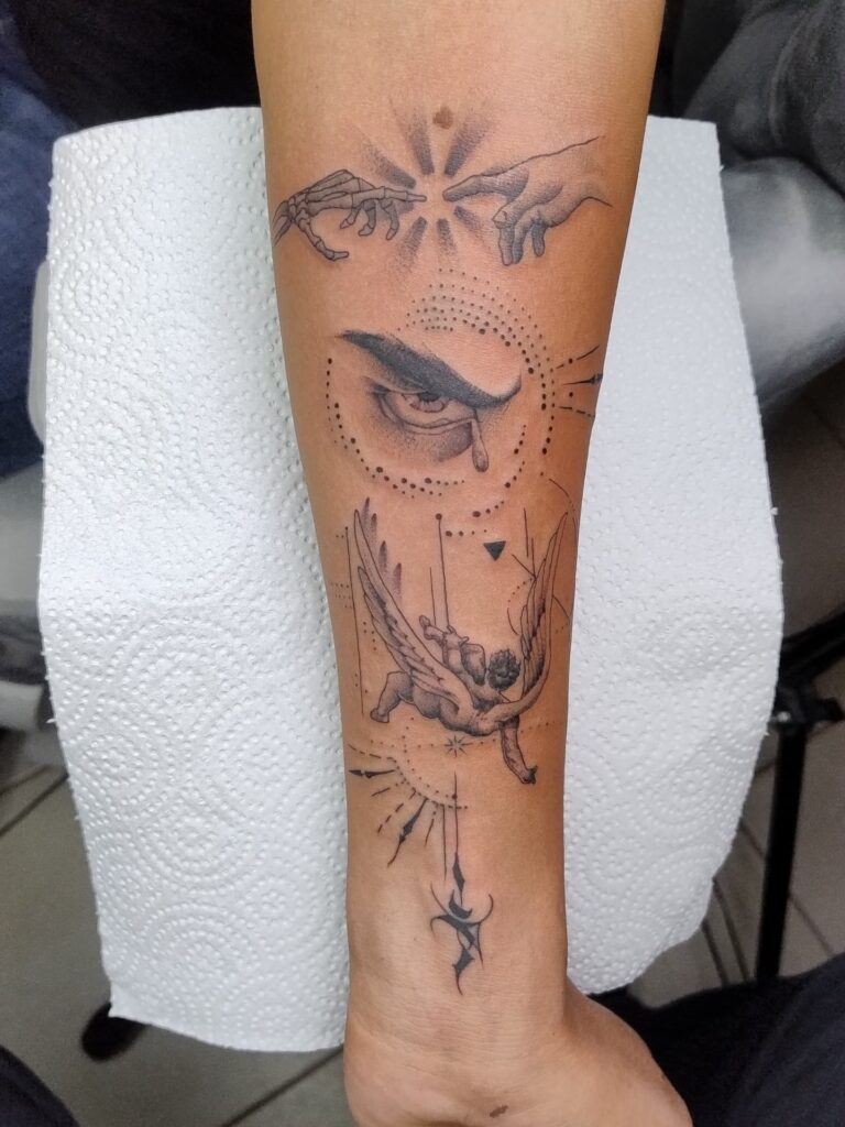 A creative tattoo blending Roman and Renaissance artistry. It showcases a detailed eye shedding a tear, an angel with wings poised in motion, and hands reminiscent of Michelangelo’s “Creation of Adam.” Radiating dots and fine lines add depth and divine energy.