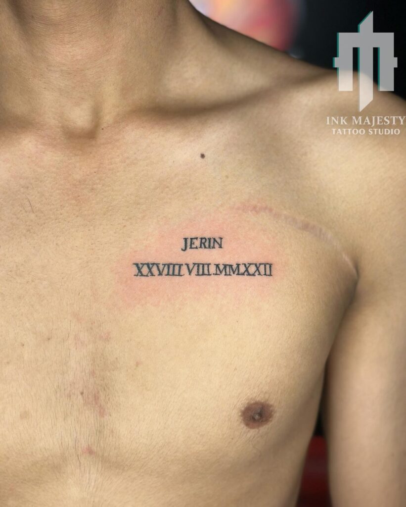 This chest tattoo combines a personal name with Roman numerals marking an important date. It merges the intimacy of identity with the grandeur of ancient Roman tradition. The bold placement ensures the design is always close to the heart, emphasizing its emotional weight.