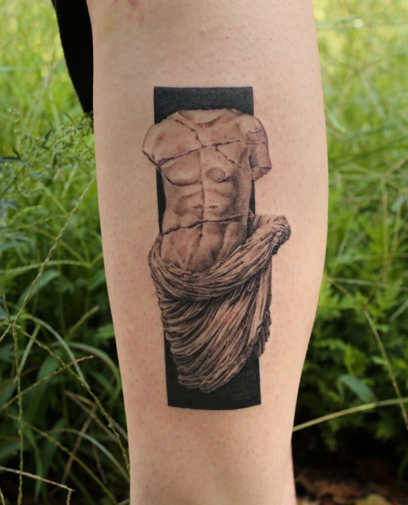 This tattoo captures the torso of a classical Roman statue, complete with detailed stone texture and folds of a draped garment. The broken, incomplete form reflects the passage of time and the endurance of Roman art through centuries of history.