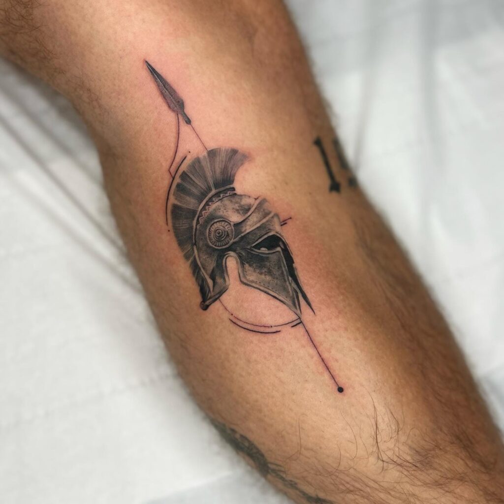 This tattoo highlights a finely detailed Roman gladiator helmet with a plume and spear. The shading and precise linework give it a lifelike, metallic quality, radiating courage and discipline. Its clean composition balances simplicity with symbolic depth.